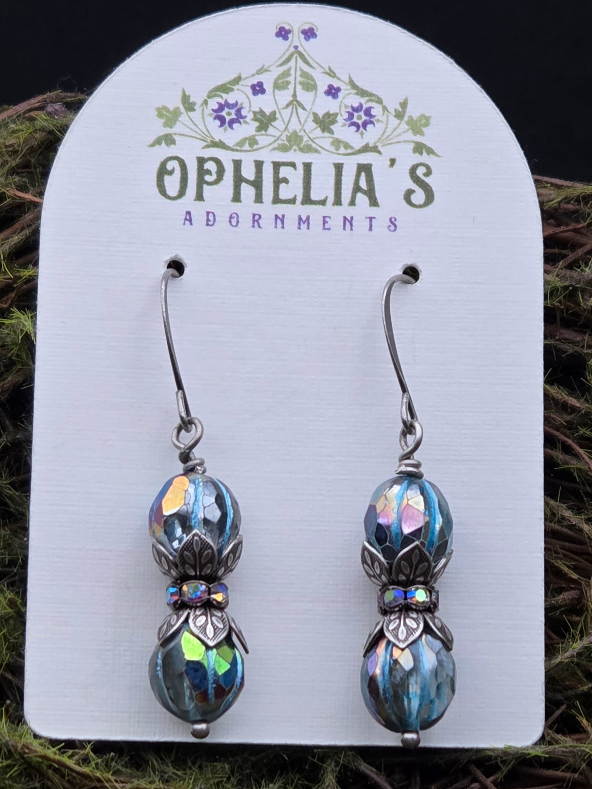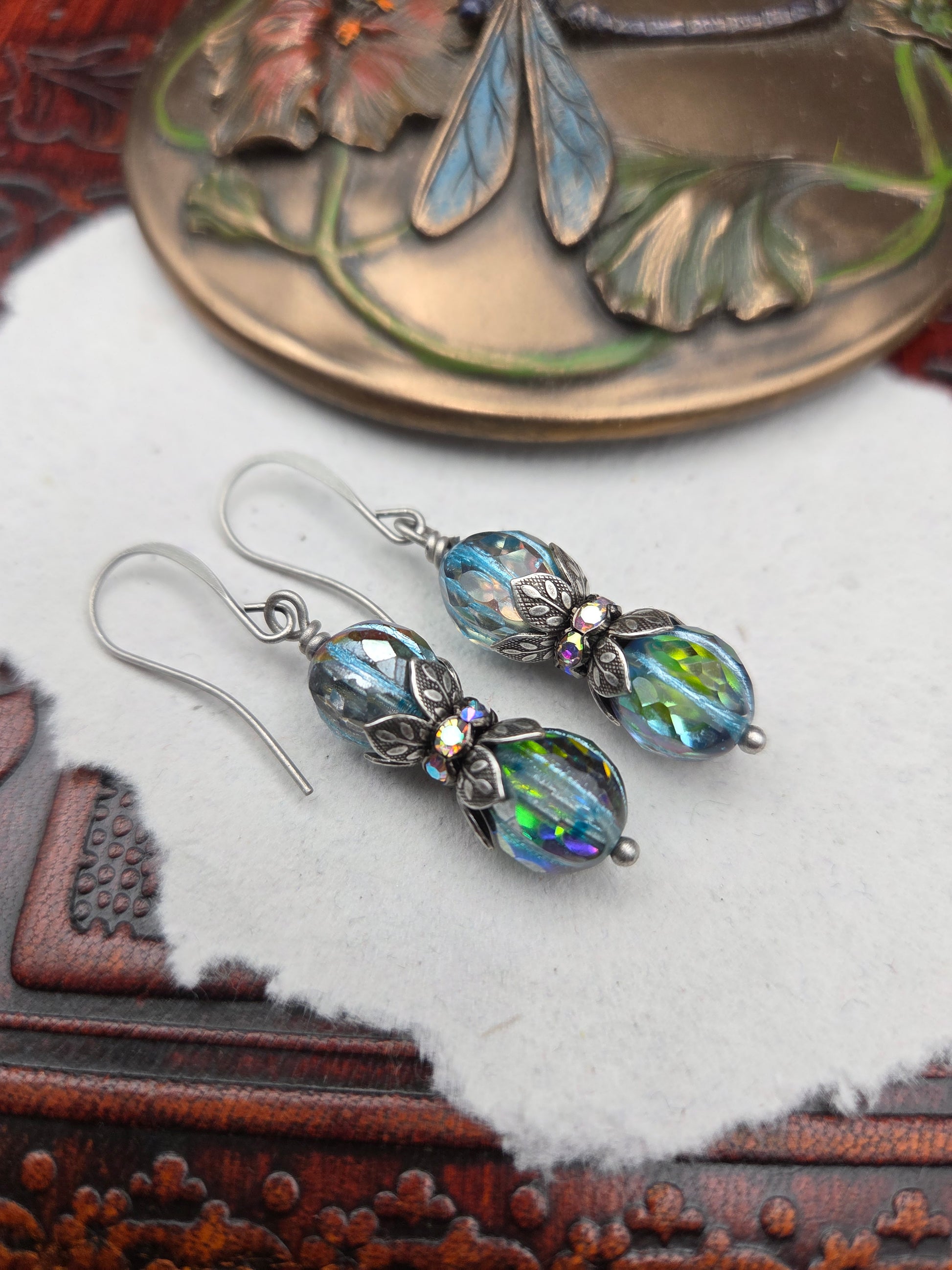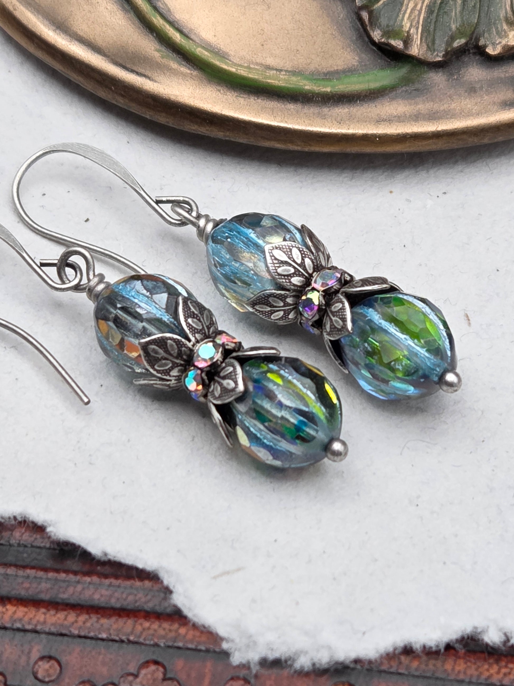 Sparkly, faceted glass beads with an aurora borealis finish are accented by leafy bead caps and crystal rondelles. Hang 2" from elongated earwires. Come with rubber stoppers for a secure fit. All metals are sterling silver over brass, nickel and lead free.