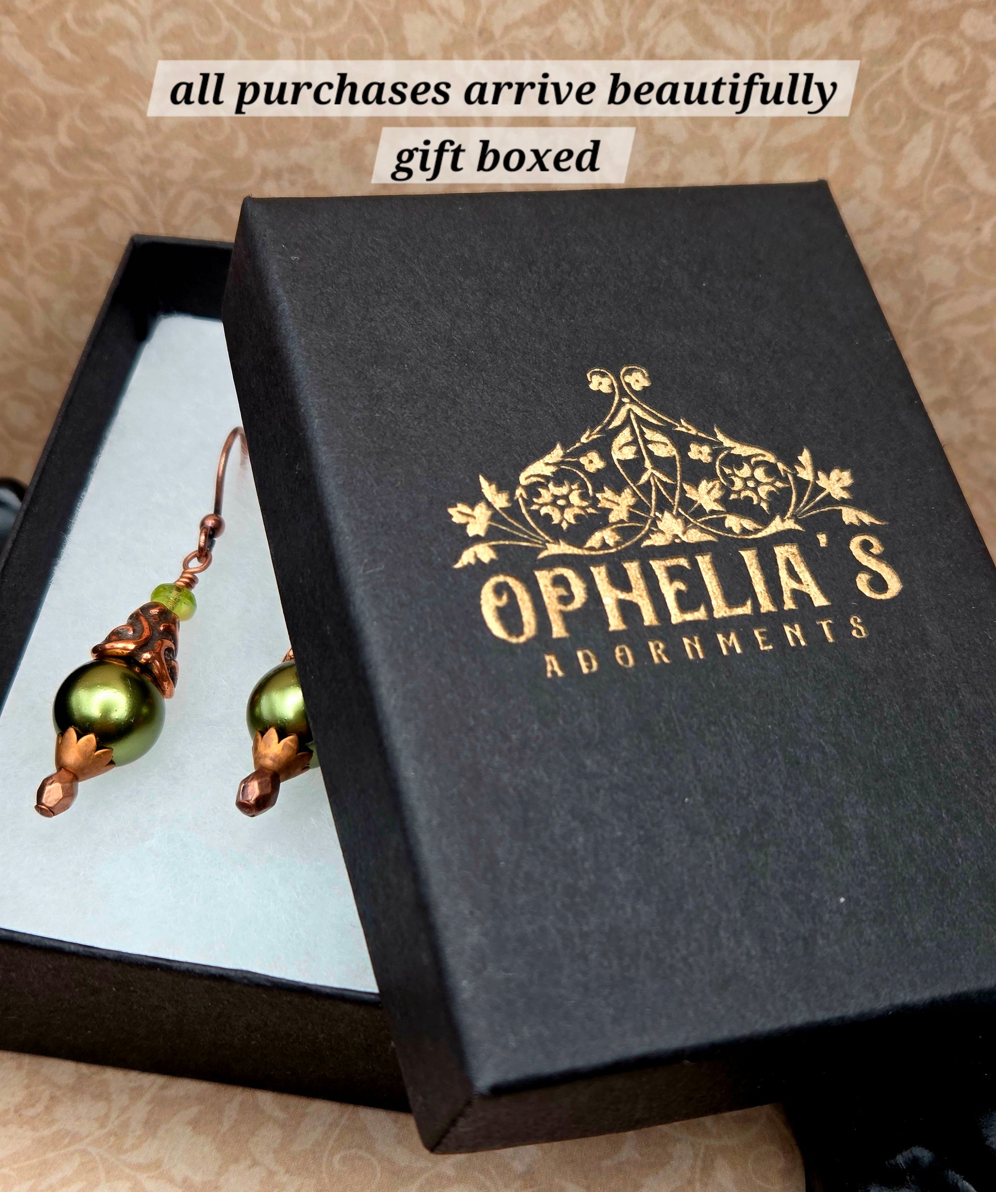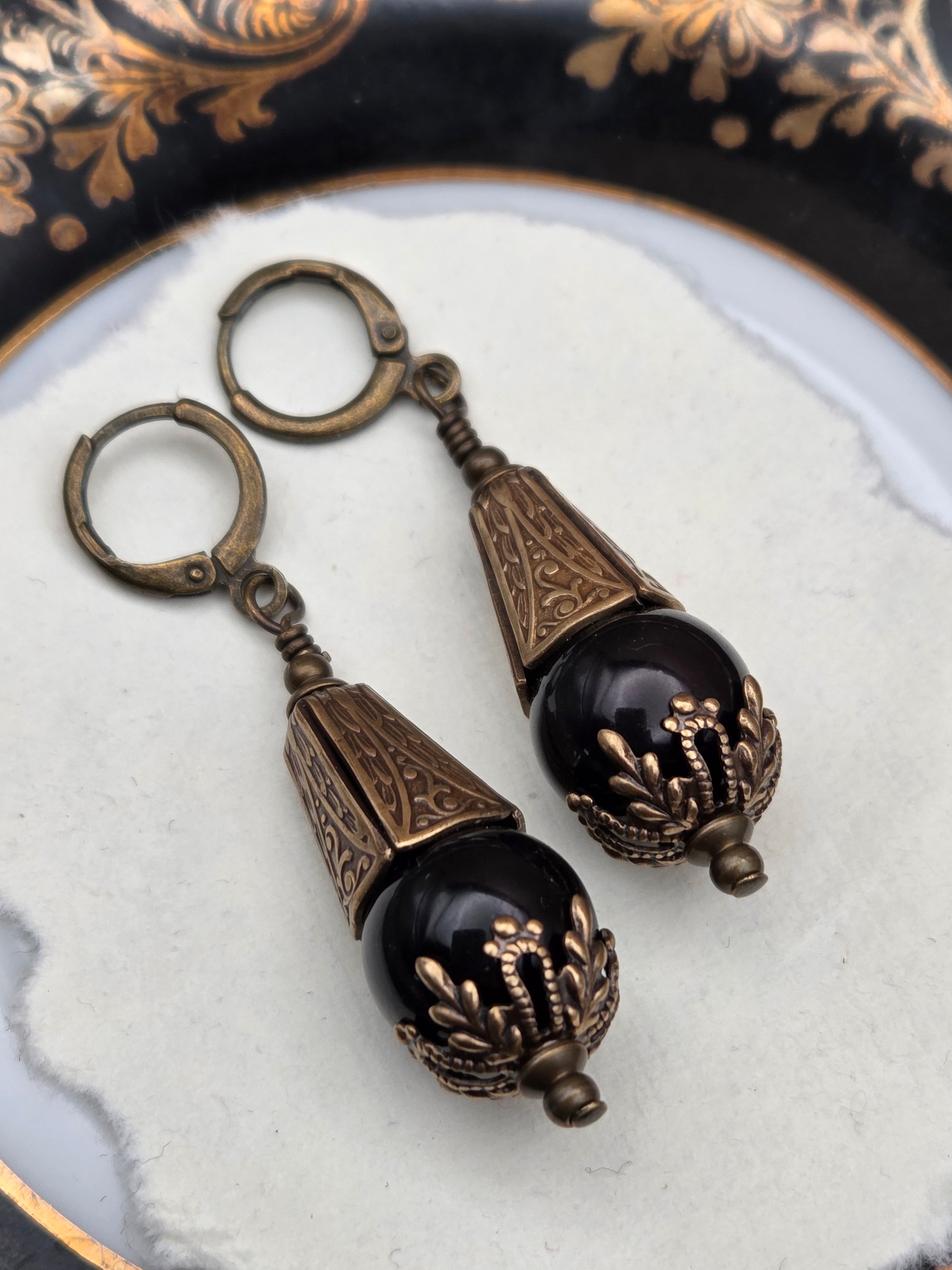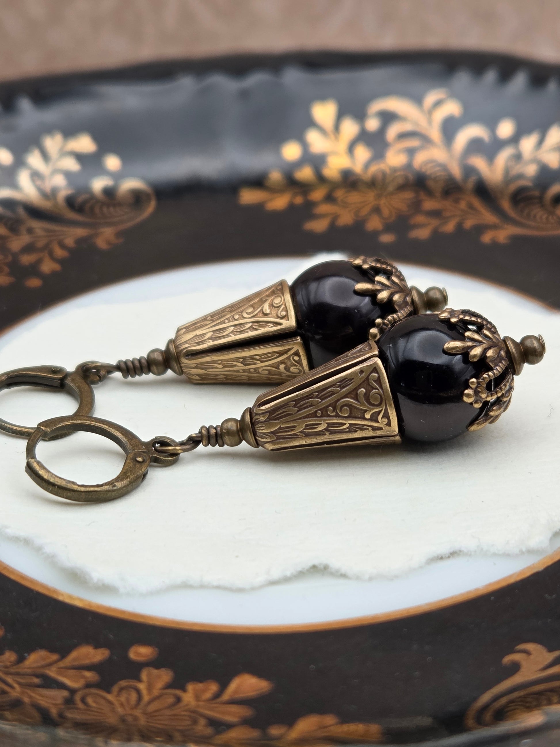 Dramatic earrings feature jet black, 12mm glass beads, accented by antiqued brass bead caps. Hang 1.5 inches, including the leverback earwires. All metal is professionally sealed antiqued brass, nickel and lead free. Arrives gift boxed.