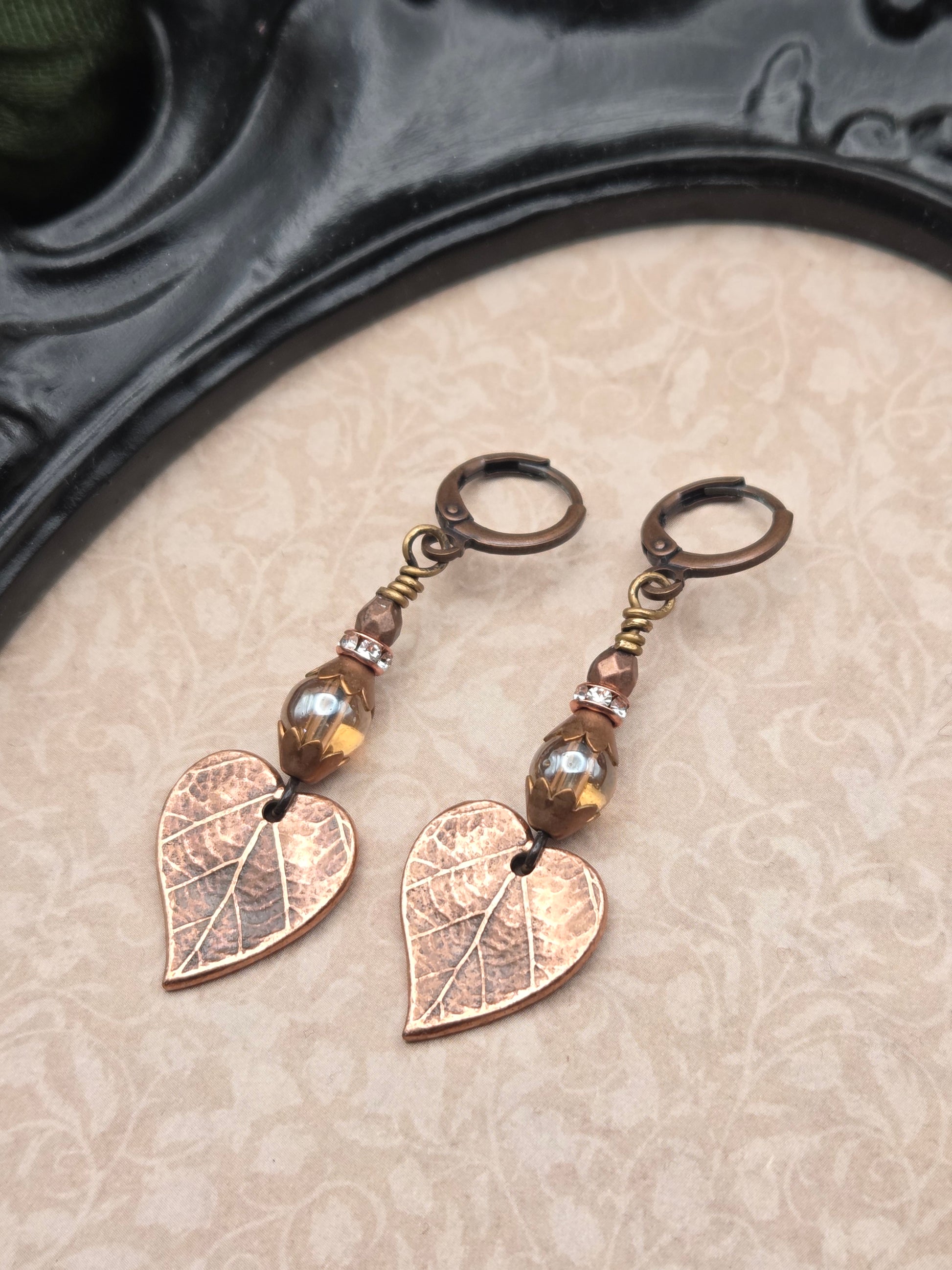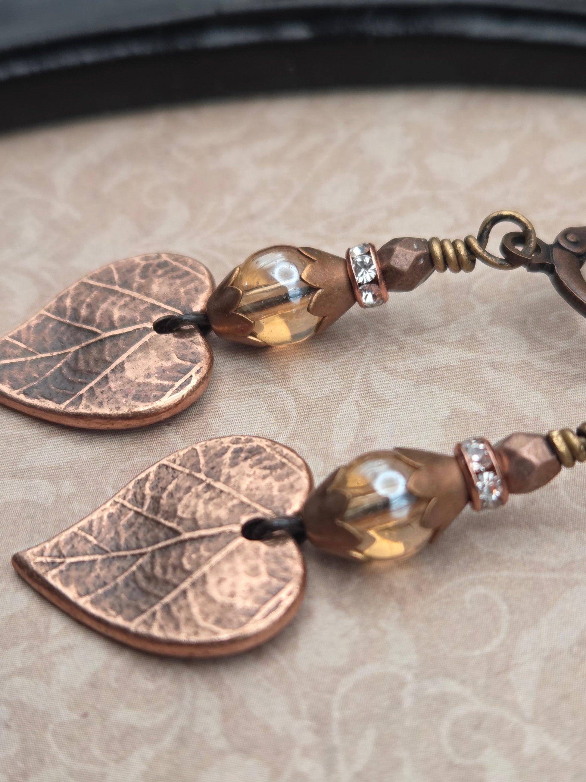 Copper leaves with a dark patina are accented by glass beads, crystals rondelles, and copper bead caps. All metal is professionally sealed, nickel and lead free. Hang 2" from leverback earwires.