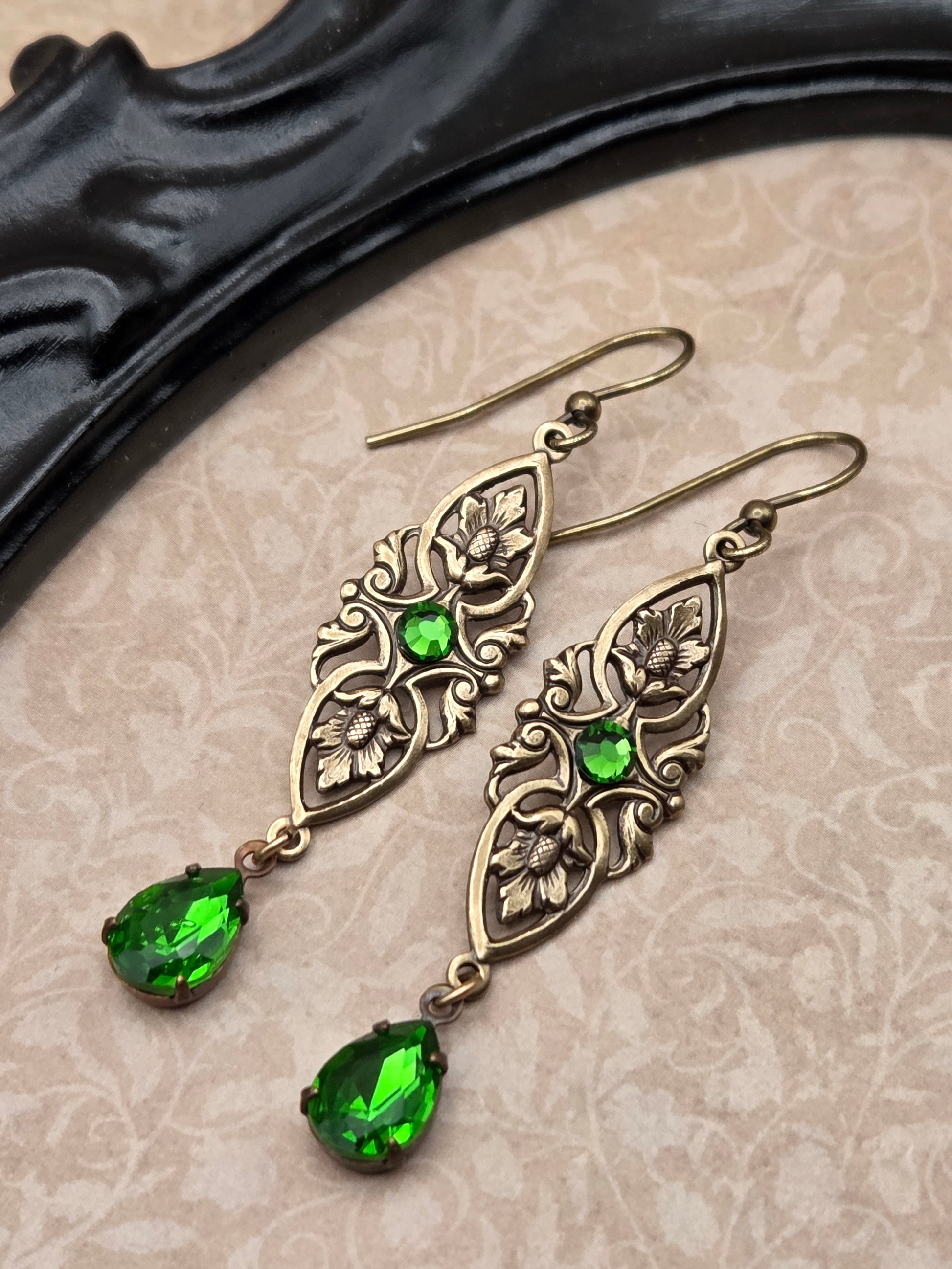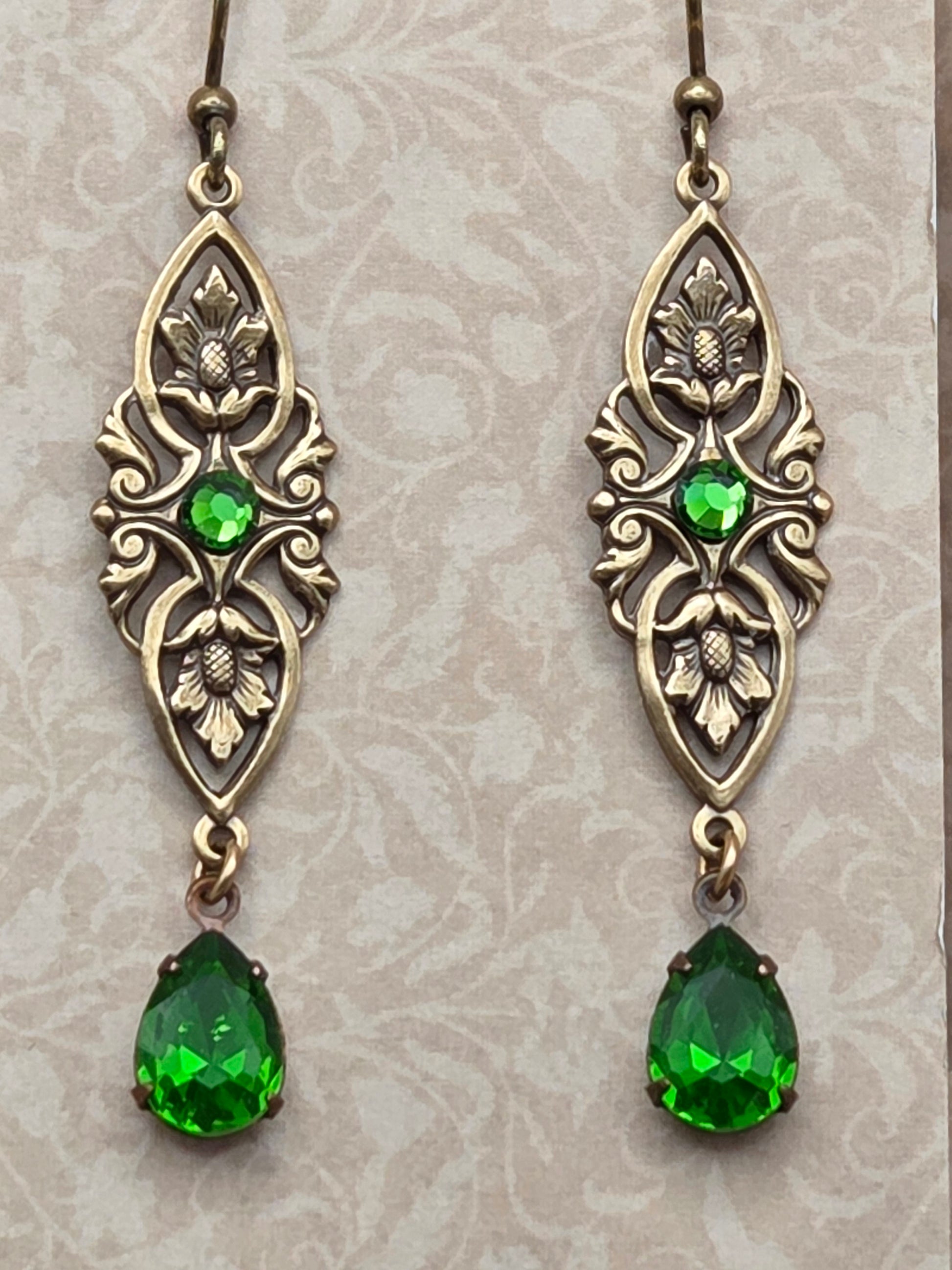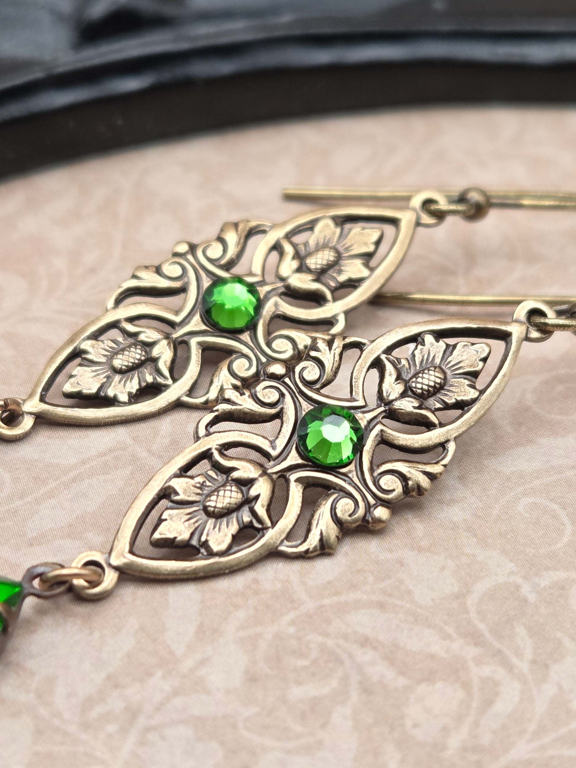 Titania is the powerful and majestic Queen of the Faeries, with a strong connection to the natural world. These earrings honor her spirit and feature beautifully detailed filigree, accented by mossy green Swarovski crystals. They hang just over 2" from french hook earwires, and are lightweight in the ears. All metal is professionally sealed antiqued brass, nickel and lead free. Arrives gift boxed.Â