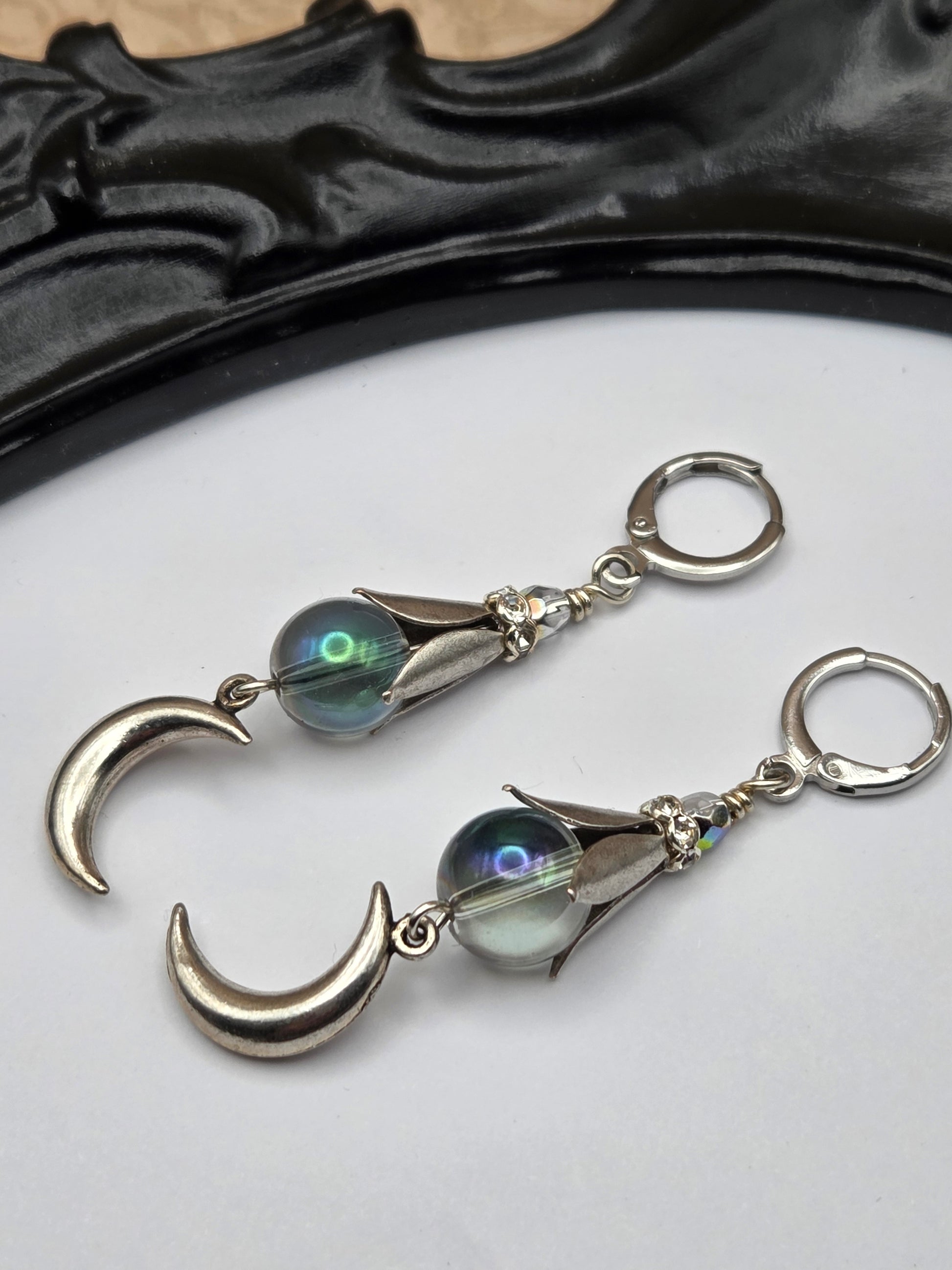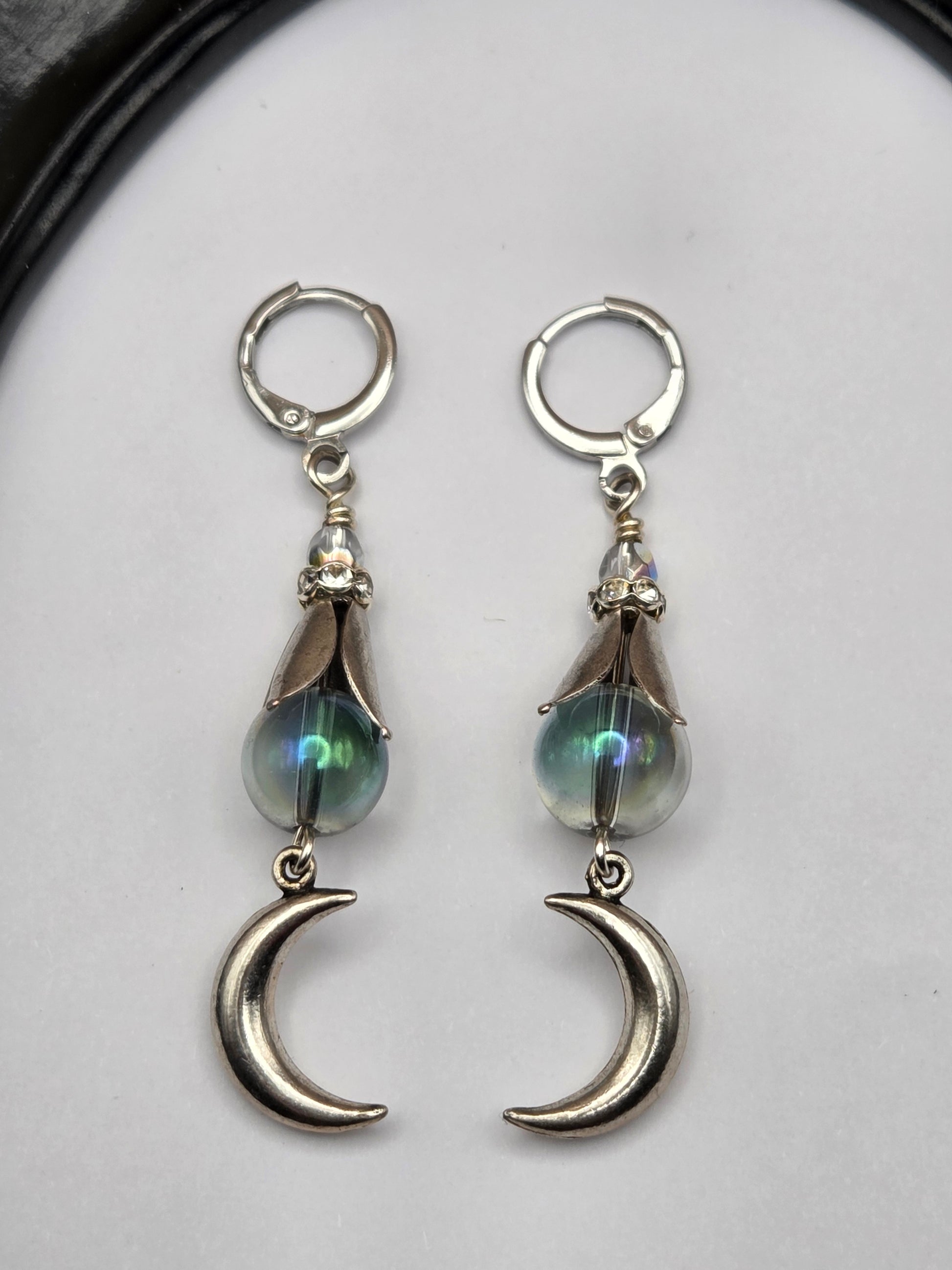 These magical earrings feature round glass beads with a subtle aurora borealis finish, accented by crescent moons, leafy bead caps, and crystals for extra sparkle. Very lightweight in the ears. Hang just over 2 inches. Leverback earwires are hypoallergenic surgical steel. All other metal is sterling silver over brass, nickel and lead free. Arrives beautifully gift boxed.
