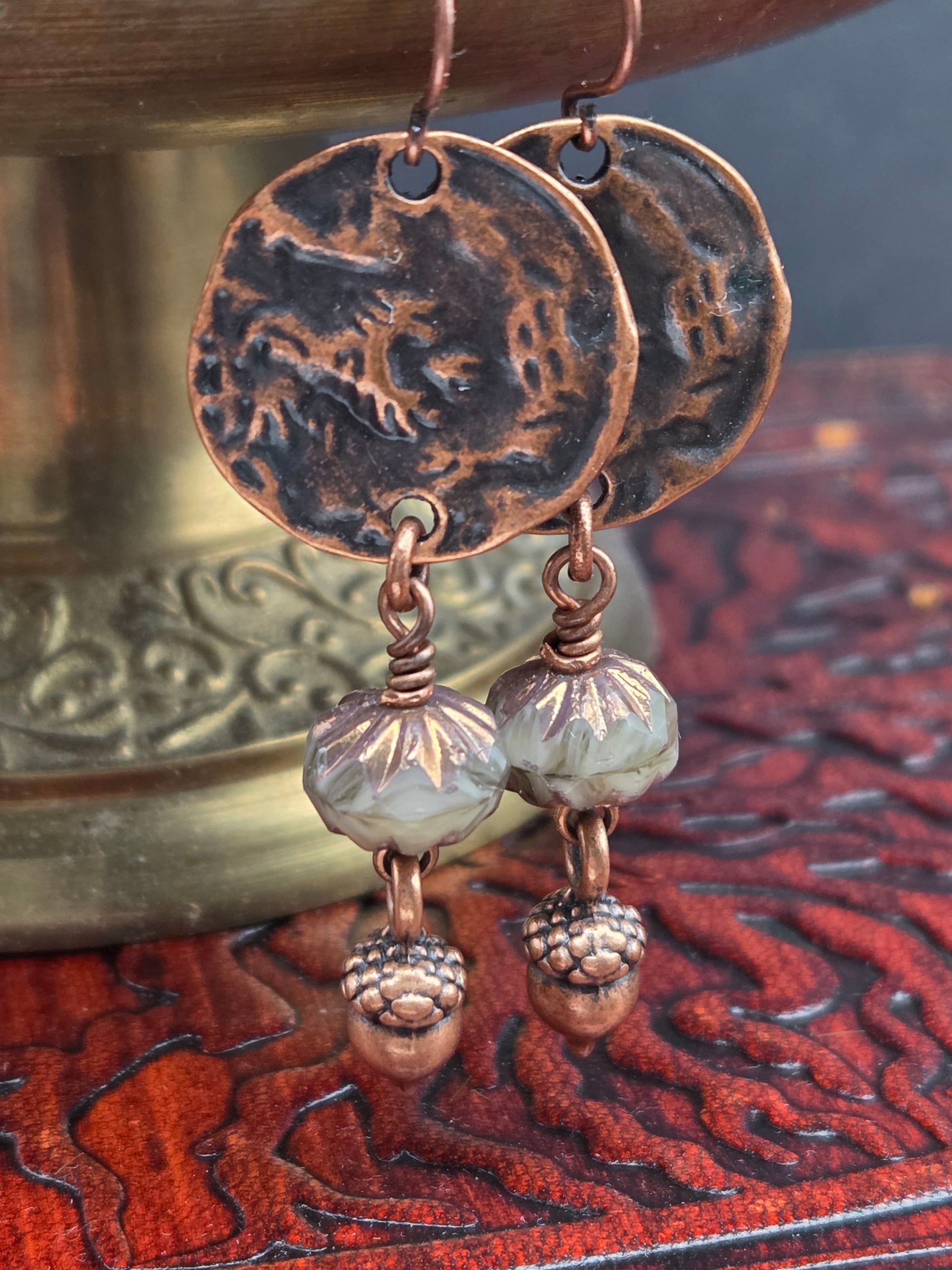 Hammered copper discs are accented by mossy glass beads and tiny acorns. Hang 2" from french hook earwires. Comes with rubber stoppers. Perfect for a trek in the forest...